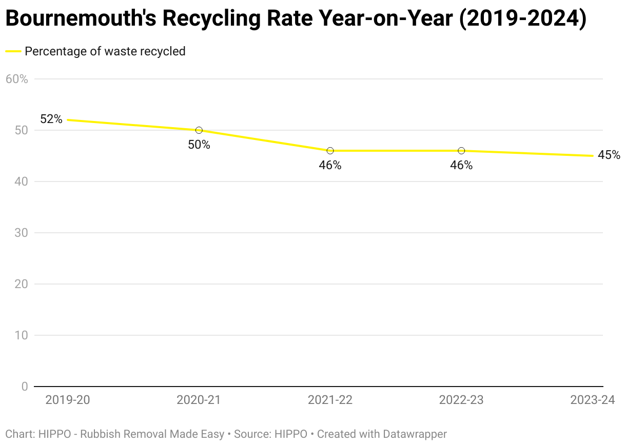 A chart displaying Bournemouth's recycling rate year-on-year. 2019-20: 52%. 2020-21: 50%. 2021-22: 46%. 2022-23: 46%. 2023-24: 45%.