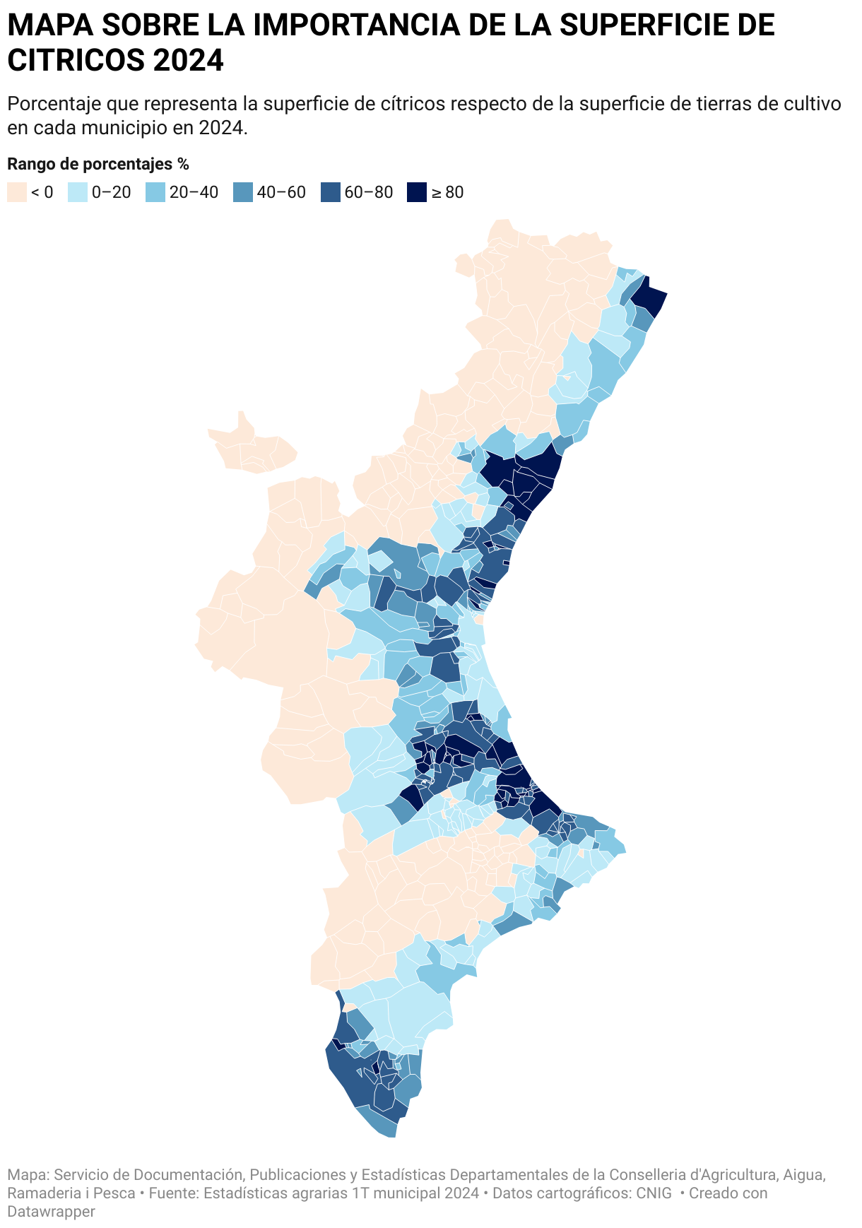 Porcentaje que representa la superficie de cítricos respecto de la superficie de tierras de cultivo en cada municipio en 2024.