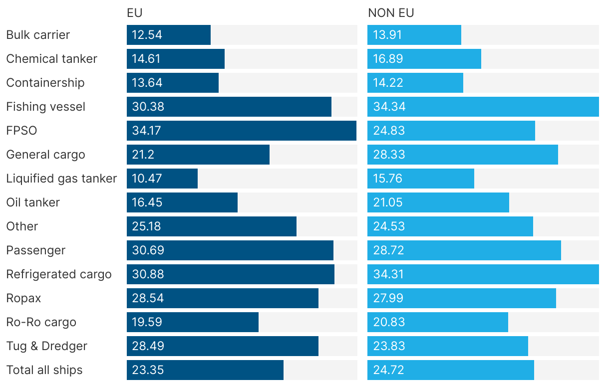 Average age of ships (in years), per ship type, according to Flag State (EU or non-EU flags).