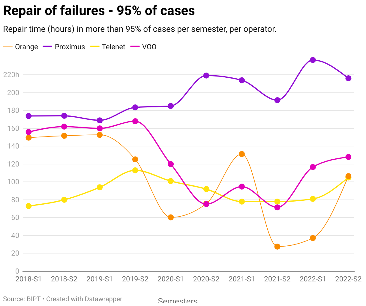 Repair time (hours) in more than 95% of cases per semester, per operator.