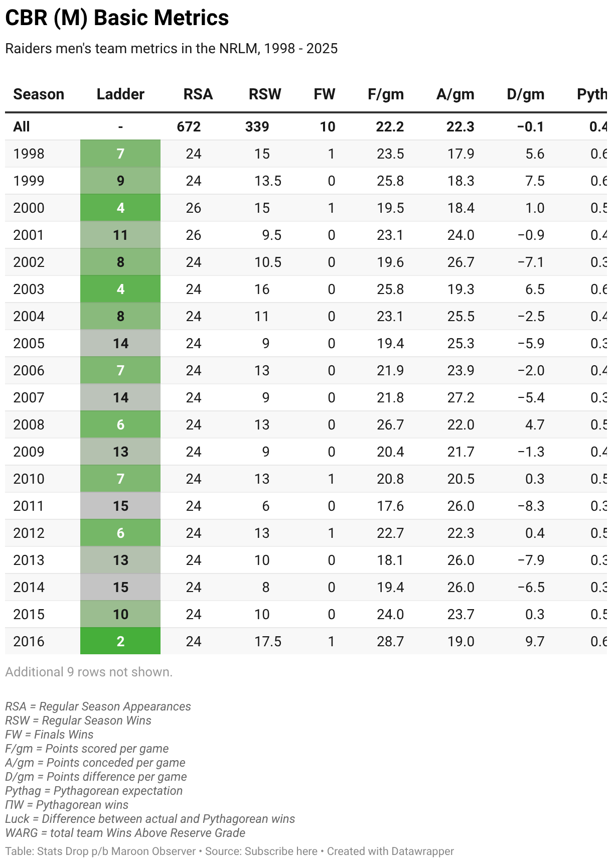 Raiders men's team metrics in the NRLM, 1998 - 2025