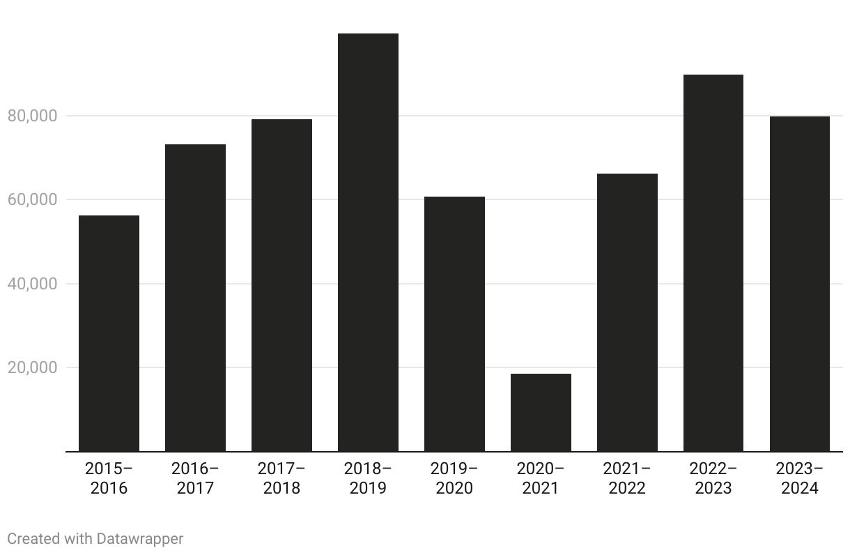 This bar chart shows the total number of New York City school bus delays and breakdowns per day by school year, from 2015–2016 to 2023–2024, based on publicly available data from the Department of Education.
