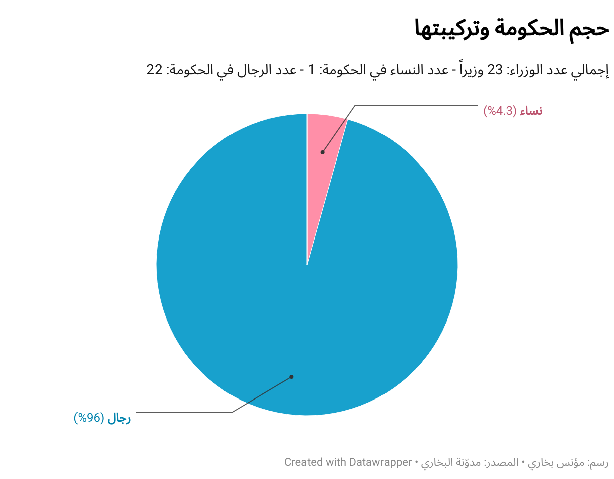 إجمالي عدد الوزراء: 23 وزيراً - عدد النساء في الحكومة: 1 - عدد الرجال في الحكومة: 22