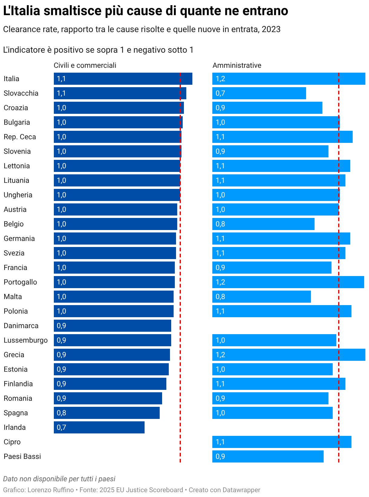 Clearance rate, rapporto tra le cause risolte e quelle nuove in entrata, 2023 L'indicatore è positivo se sopra 1 e negativo sotto 1