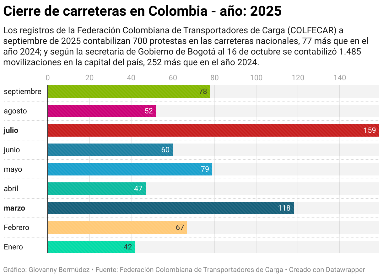 Los registros de la Federación Colombiana de Transportadores de Carga (COLFECAR) a septiembre de 2025 contabilizan 700 protestas en las carreteras nacionales, 77 más que en el año 2024; y según la secretaria de Gobierno de Bogotá al 16 de octubre se contabilizó 1.485 movilizaciones en la capital del país, 252 más que en el año 2024.