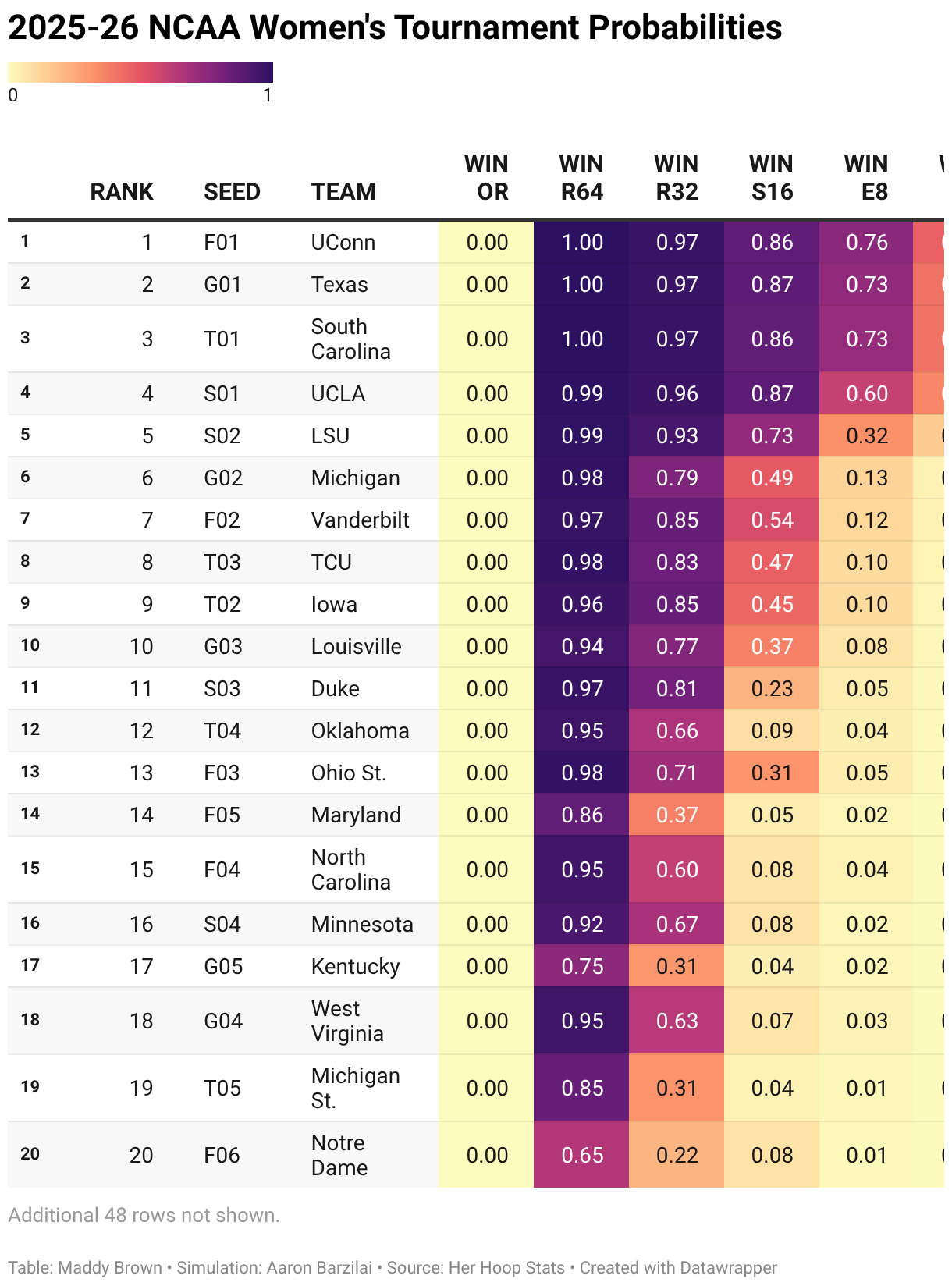 Table of NCAA women's basketball tournament win probabilities for each of the 68 teams in the 2025-26 tournament in each of the rounds. UConn has 26% chance to win it all, the highest of any team.