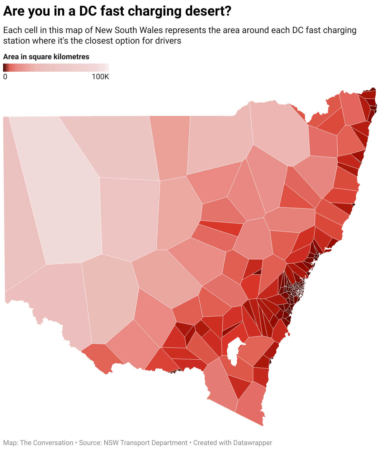 Each cell in this map of New South Wales represents the area around each DC fast charging station where it's the closest option for drivers