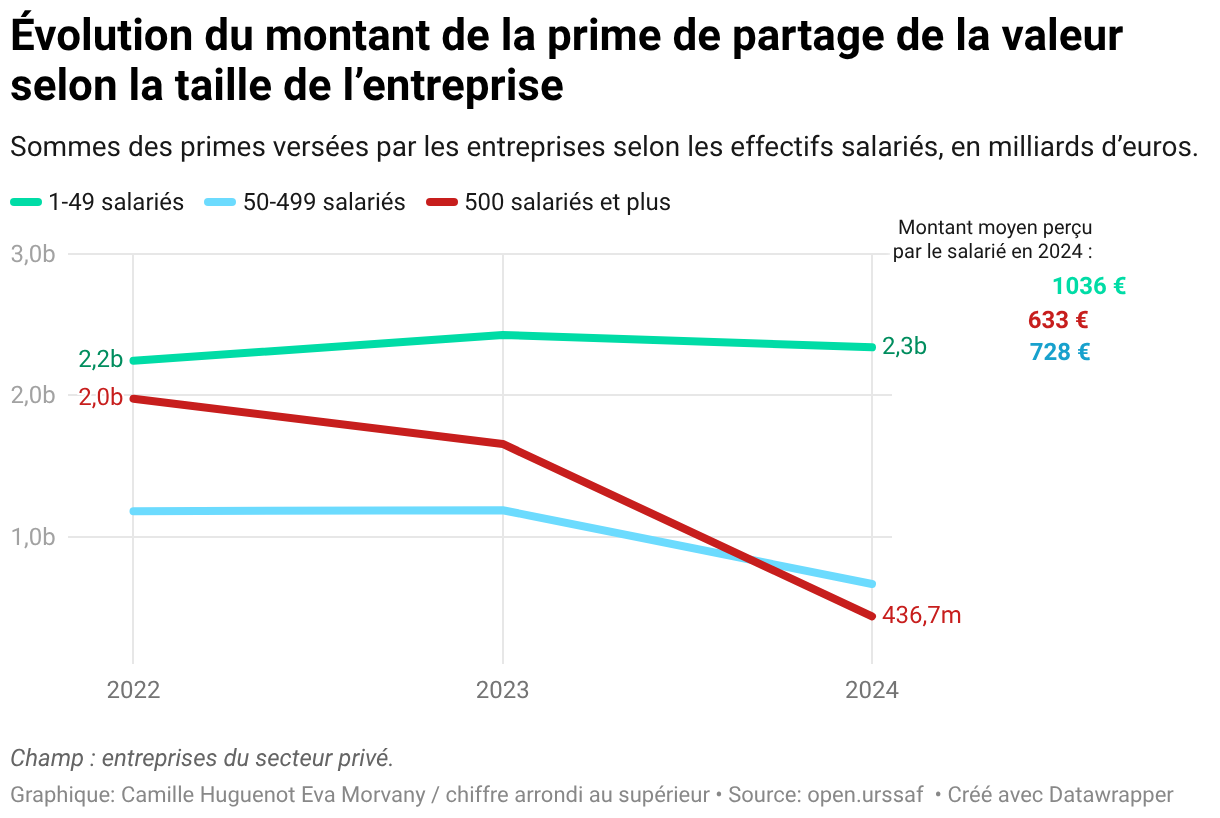 Sommes des primes versées par les entreprises selon les effectifs salariés, en milliards d’euros.