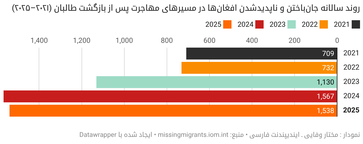 روند سالانه جانباختن و ناپدیدشدن افغانها در مسیرهای مهاجرت پس از بازگشت طالبان (۲۰۲۱–۲۰۲۵)