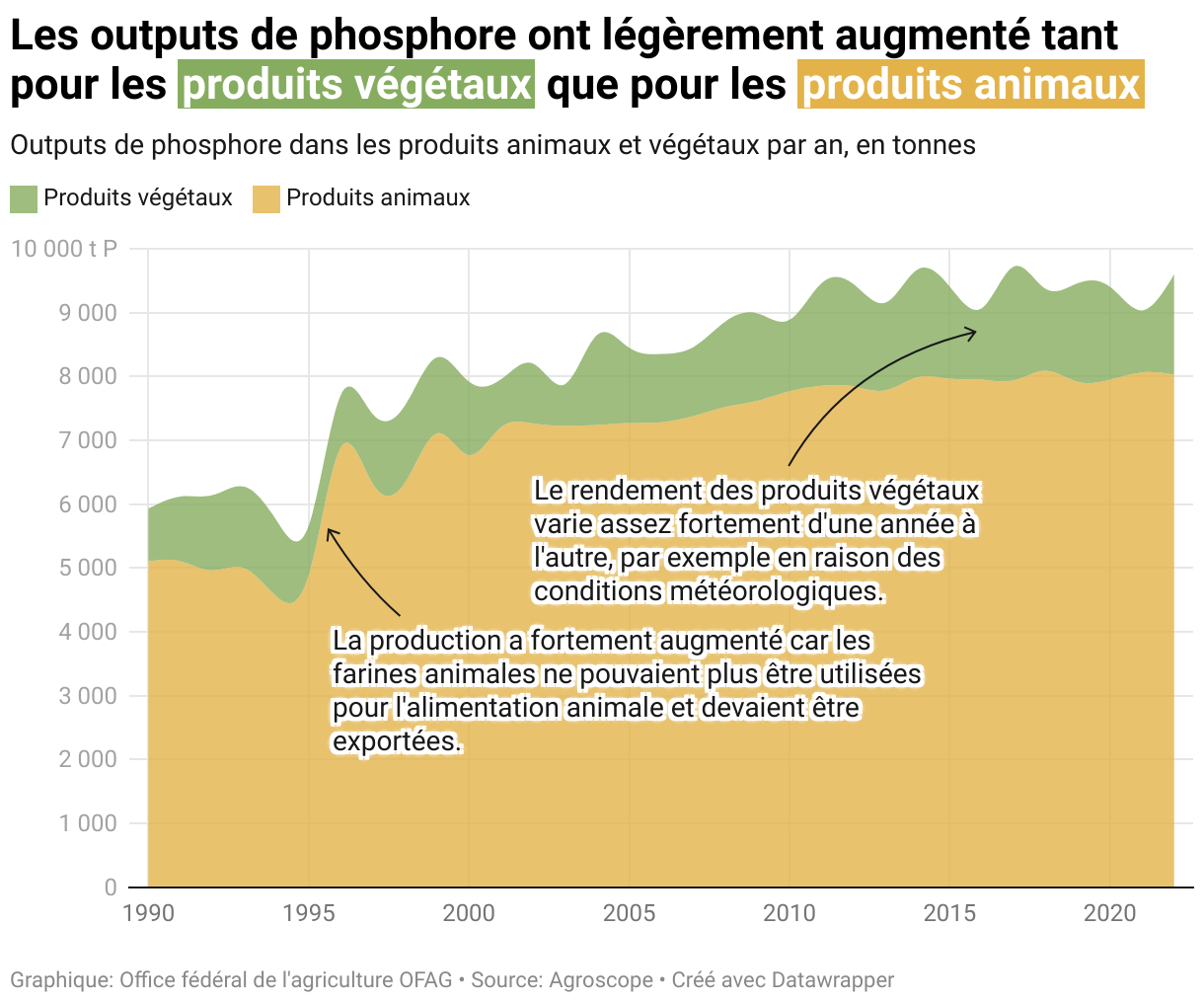 Outputs de phosphore dans les produits animaux et végétaux par an, en tonnes