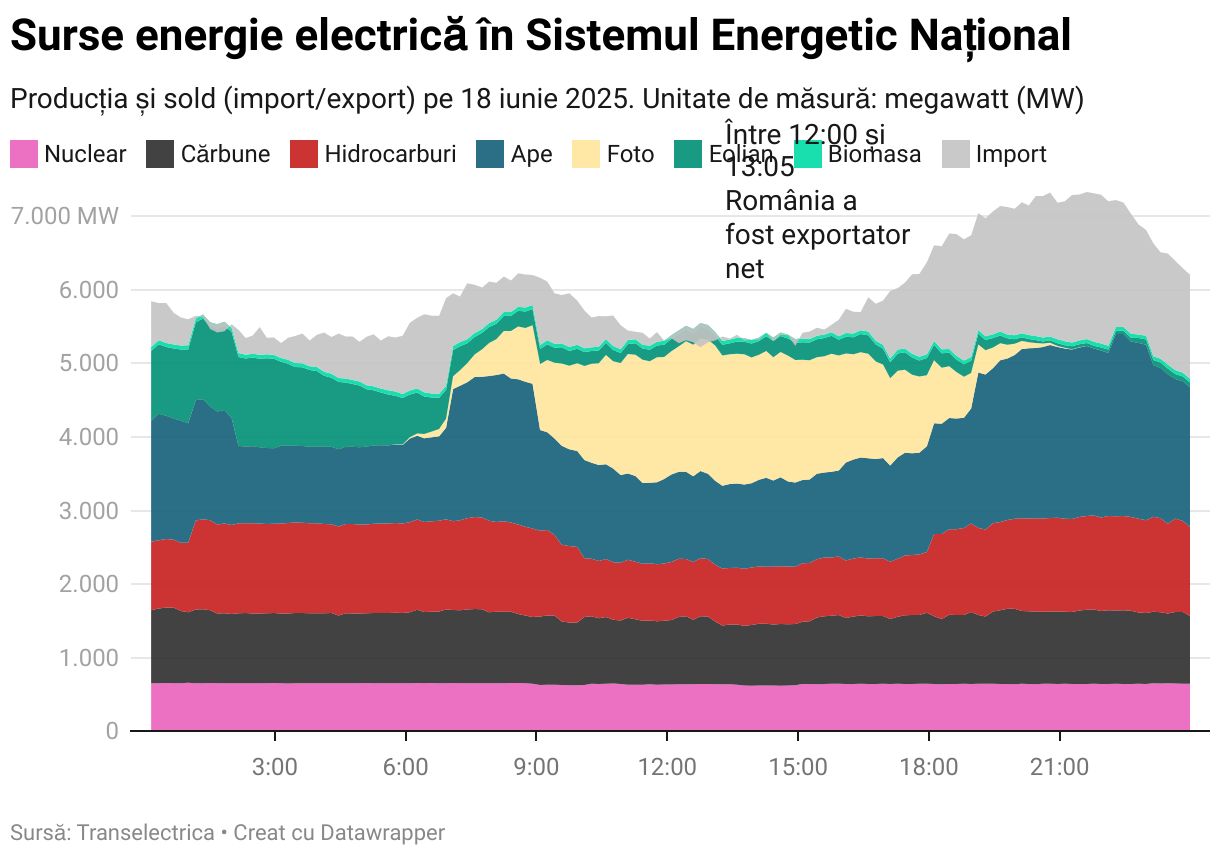 Producția și sold (import/export) pe 18 iunie 2025. Unitate de măsură: megawatt (MW)