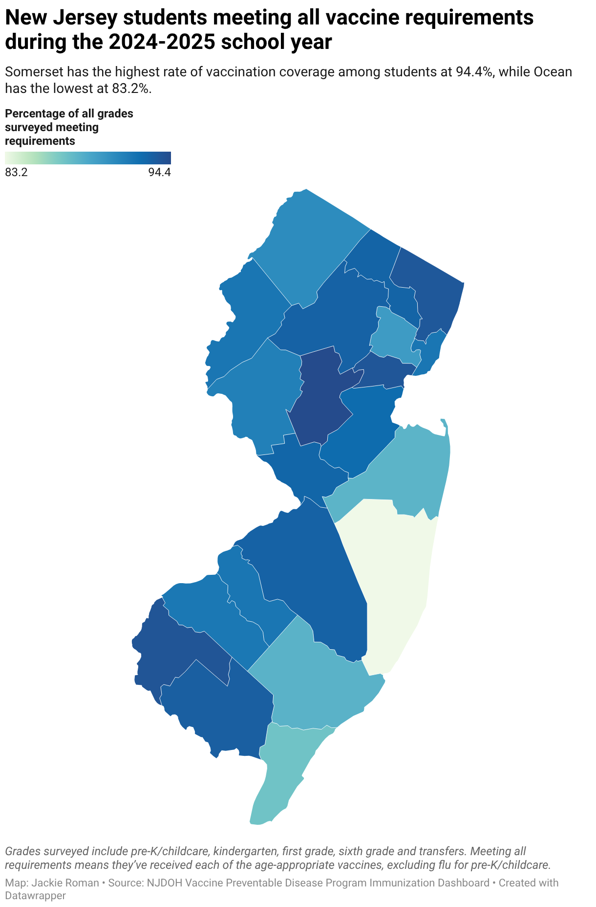 Vaccination rates among students are highest in Somerset (94.4%), Salem (93.8), and Union (93.7). They're lowest in Ocean (83.2), Cape May (87.2), and Monmouth (88.1).