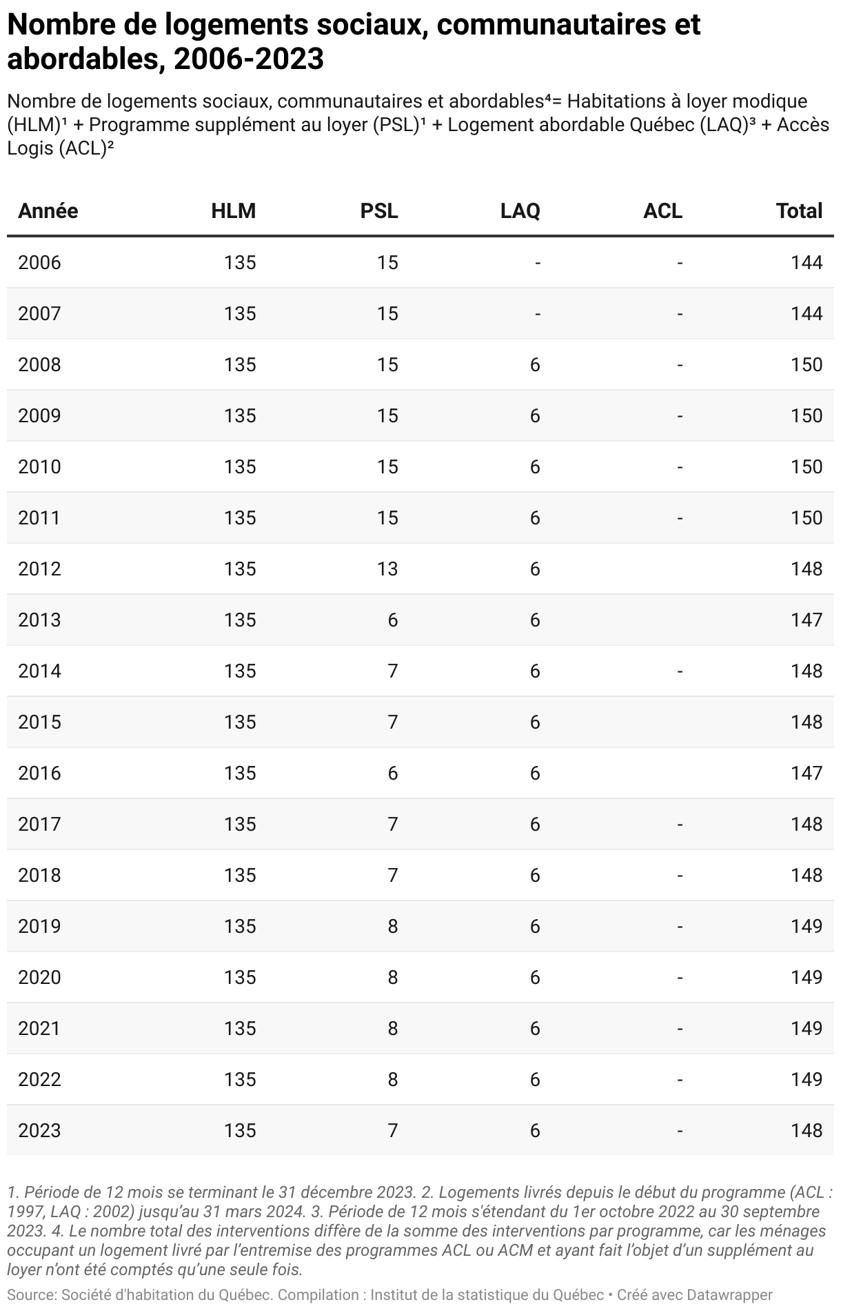 Nombre de logements sociaux, communautaires et abordables⁴= Habitations à loyer modique (HLM)¹ + Programme supplément au loyer (PSL)¹ + Logement abordable Québec (LAQ)³ + Accès Logis (ACL)²