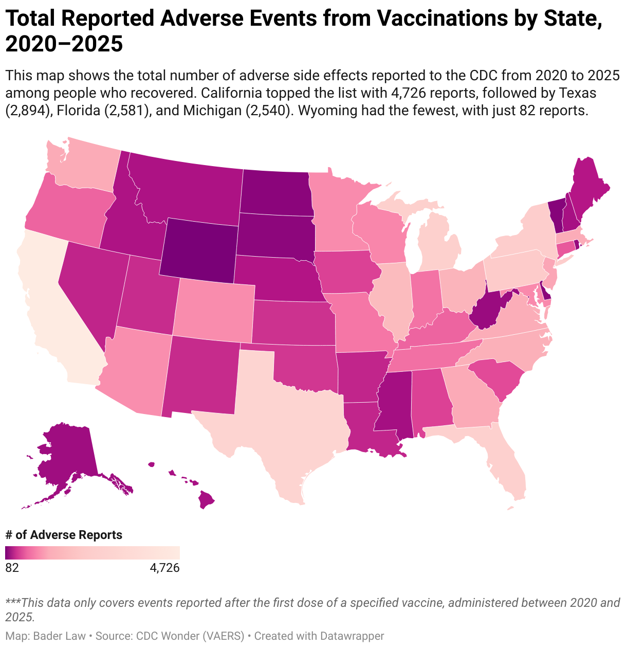 This map shows the total number of adverse side effects reported to the CDC from 2020 to 2025 among people who recovered. California topped the list with 4,726 reports, followed by Texas (2,894), Florida (2,581), and Michigan (2,540). Wyoming had the fewest, with just 82 reports.