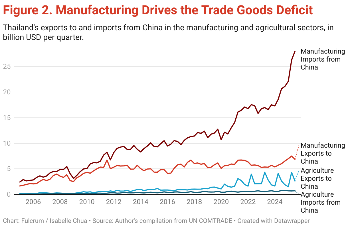Thailand's exports to and imports from China in the manufacturing and agricultural sectors, in billion USD per quarter.