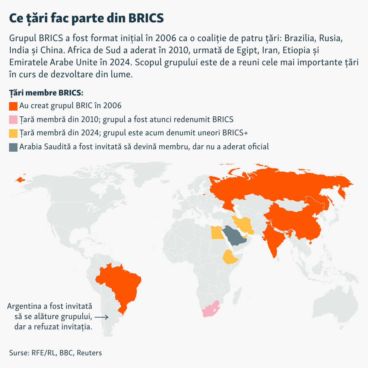 Grupul BRICS a fost format inițial în 2006 ca o coaliție de patru țări: Brazilia, Rusia, India și China. Africa de Sud a aderat în 2010, urmată de Egipt, Iran, Etiopia și Emiratele Arabe Unite în 2024. Scopul grupului este de a reuni cele mai importante țări în curs de dezvoltare din lume.