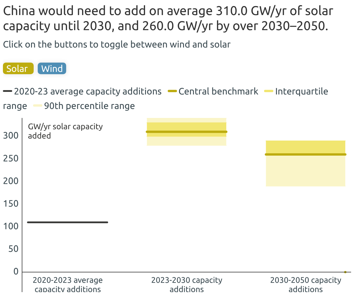 China would need to add on average 310.0 GW/yr of solar capacity until 2030, and 260.0 GW/yr by over 2030–2050.