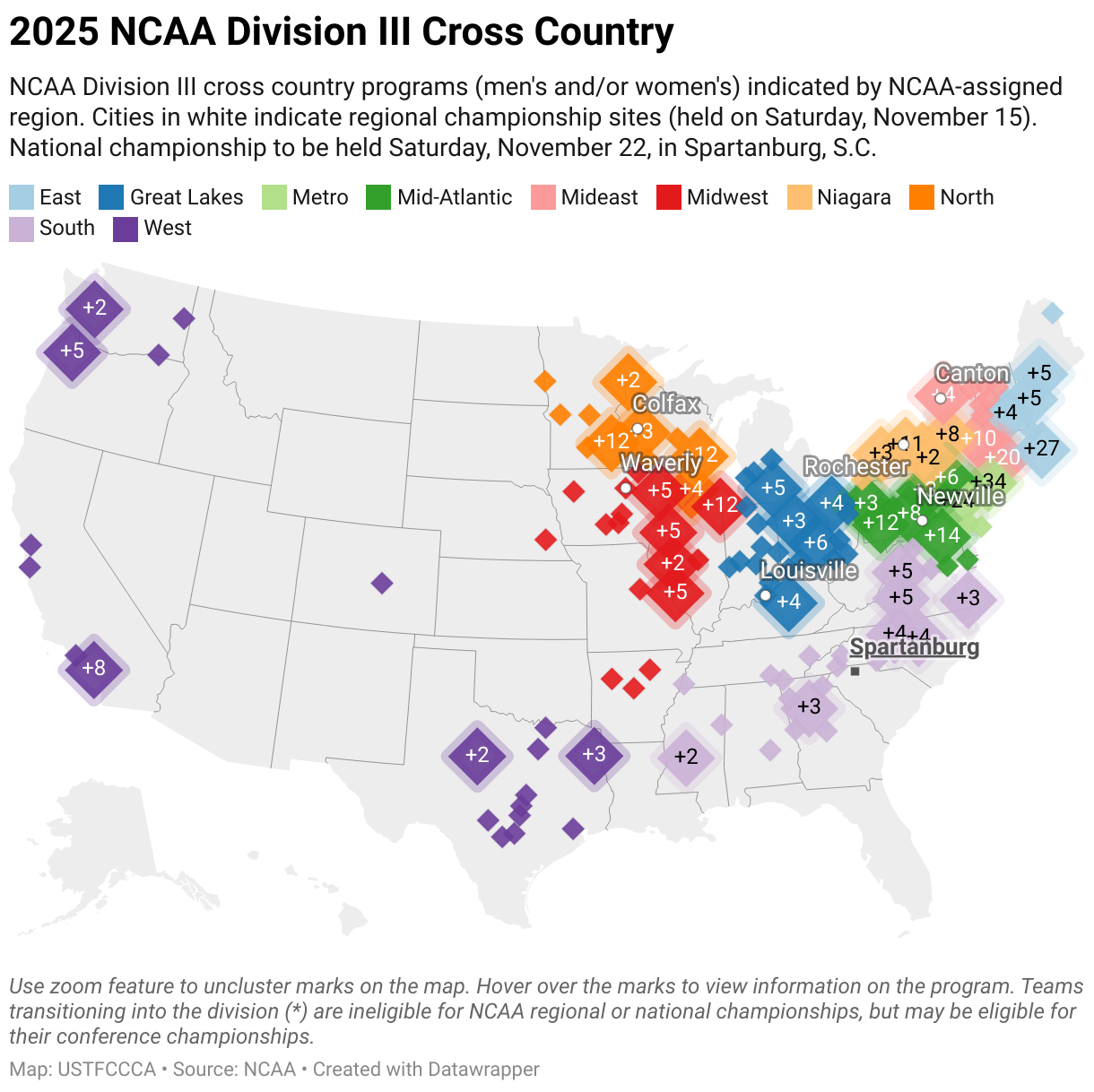 NCAA Division III cross country programs (men's and/or women's) indicated by NCAA-assigned region. Cities in white indicate regional championship sites (held on Saturday, November 15). National championship to be held Saturday, November 22, in Spartanburg, S.C.