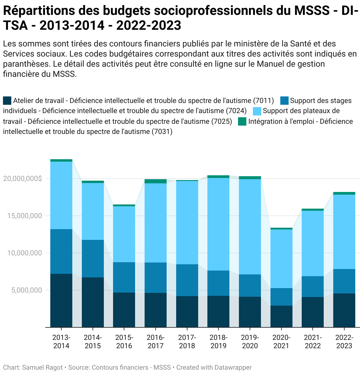 Les sommes sont tirées des contours financiers publiés par le ministère de la Santé et des Services sociaux. Les codes budgétaires correspondant aux titres des activités sont indiqués en paranthèses. Le détail des activités peut être consulté en ligne sur le Manuel de gestion financière du MSSS.