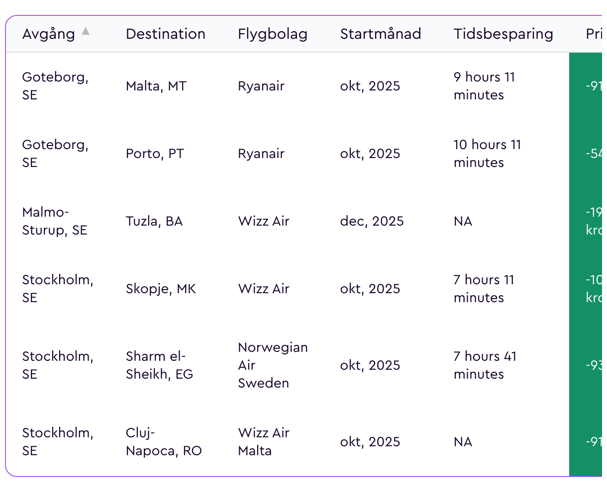 Sparade pengar: För att beräkna besparingar på flygbiljetter jämförde momondo tur- och returpriser på flyg i ekonomiklass för nya direktrutter med alternativ utan direktflyg för samma avreseplatser och destinationer med sökningar mellan den 21 juni 2025 och den 21 september 2025 för resor mellan den 1 oktober och 31 december 2025. Besparingarna är genomsnittliga och kan komma att ändras. Nya flygrutter: Flygtrafikdata för 2025 hämtades från Cirium. Nya direktrutter identifierades genom att jämföra flygscheman för 2025 med 2024, med fokus på direktrutter som inte tidigare fanns. För varje rutt anges flygbolaget som trafikerar linjen och startdatumet. Sparad tid: För att beräkna tidsbesparingarna jämförde momondo flygtiden för de nya direktrutterna med alternativ utan direktflyg för samma avreseplatser och destinationer med sökningar mellan den 21 mars 2025 och 21 september 2025 för resor mellan 1 april och 31 december 2025. Udvalg af nye flyruter: Flytrafikdata for 2025 blev hentet fra Cirium. Nye direkte ruter blev fundet ved at sammenligne fartplanerne for 2025 med dem fra 2024 og fremhæve direkte flyruter, som ikke fandtes tidligere. For hver rute præsenteres det flyselskab, der betjener den, og lanceringsdatoen. Tidsbesparelser: For at beregne tidsbesparelser har momondo sammenlignet flyvetiden på de nye direkte ruter med alternative ruter med mellemlanding. Sammenligningen er lavet for de samme kombinationer af afrejselufthavn og destination, der blev søgt på mellem 21. marts 2025 og 21. september 2025 for rejser mellem 1. april og 31. december 2025.