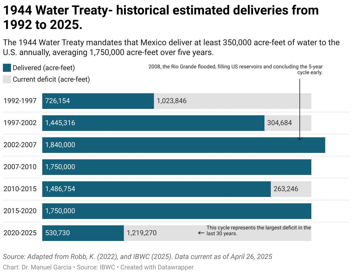 The 1944 Water Treaty mandates that Mexico deliver at least 350,000 acre-feet of water to the U.S. annually, averaging 1,750,000 acre-feet over five years.