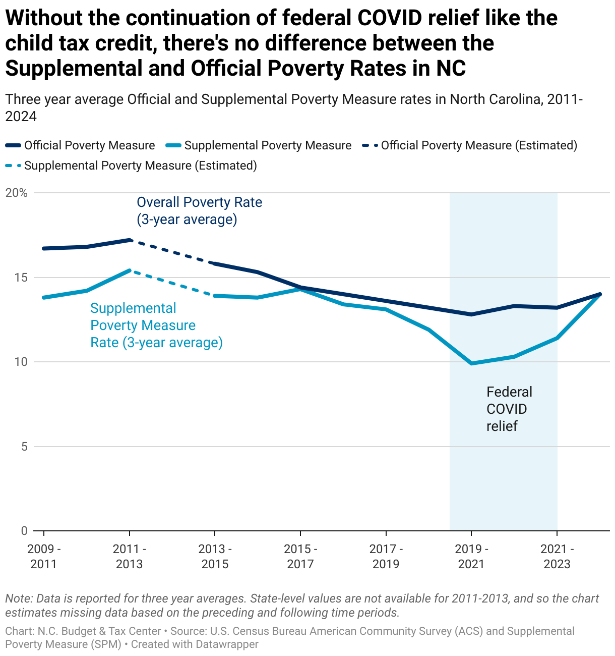 Without the continuation of federal COVID relief like the child tax credit, there's no difference between the Supplemental and Official Poverty Rates in NC