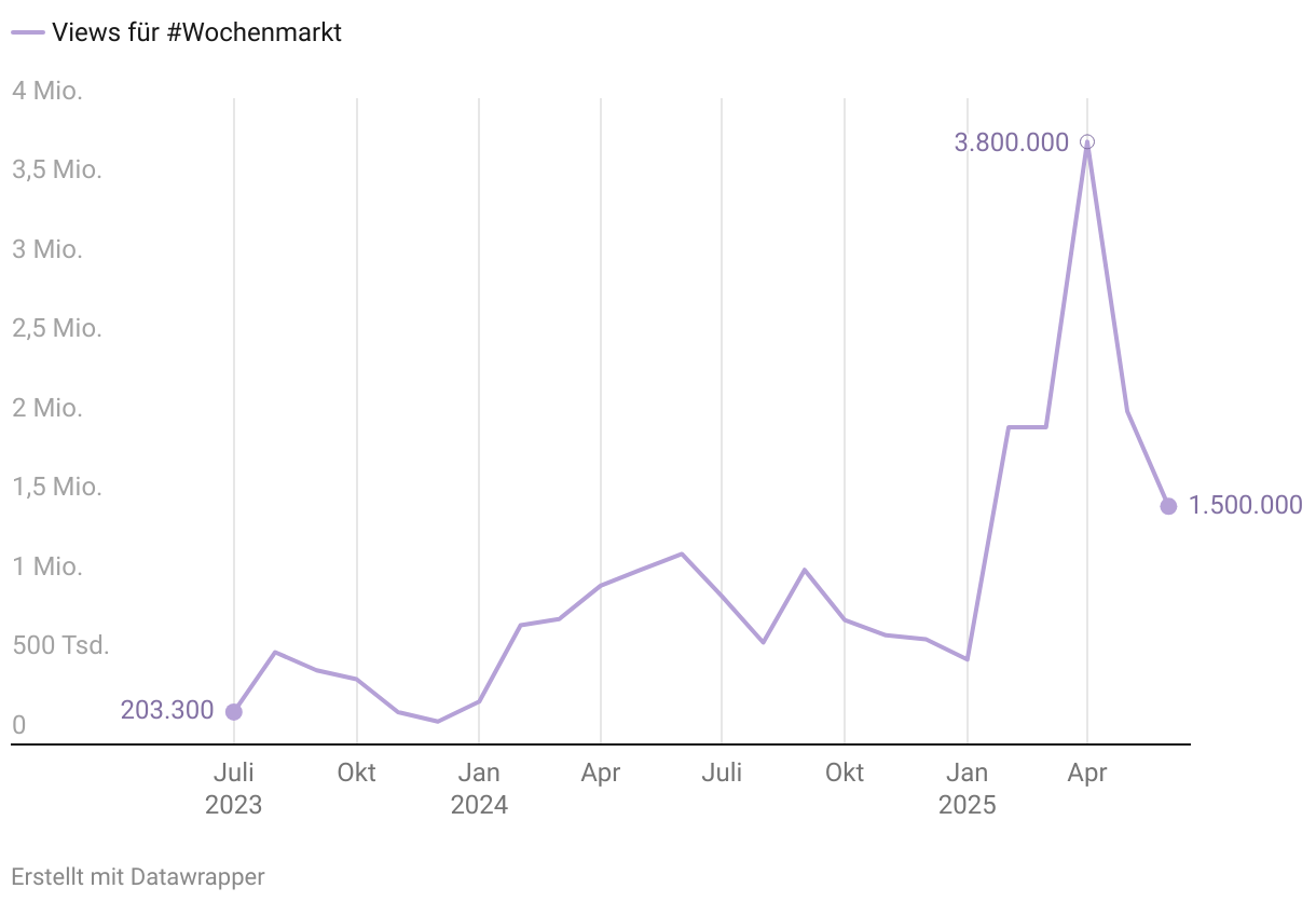 Anzahl der Views der Videos, die mit dem #wochenmarkt zwischen Juli 2023 und Juli 2025 veröffentlicht wurden. Zwischen Juli 23 und Januar 25 recht gleichbleibende Zahlen unter einer Million, im Frühjahr 2025 ein rasanter Anstieg bis fast zu vier Millionen Aufrufen.