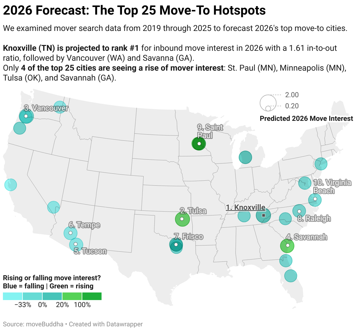 Knoxville (TN) is projected to rank #1 for inbound move interest in 2026 with a 1.61 in-to-out ratio, followed by Vancouver (WA) and Savanna (GA).