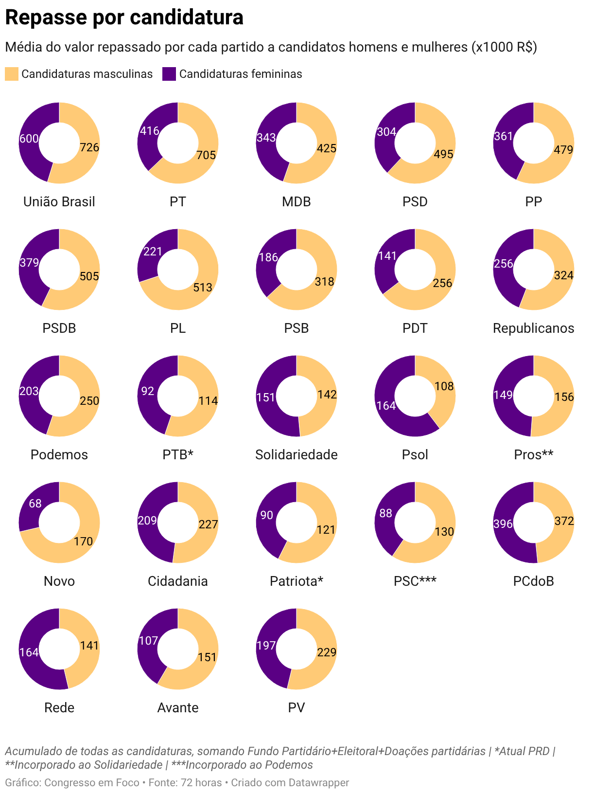 Média do valor repassado por cada partido a candidatos homens e mulheres (x1000 R$)