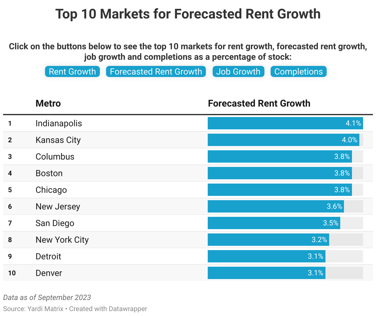 Click on the buttons below to see the top 10 markets for rent growth, forecasted rent growth, job growth and completions as a percentage of stock: