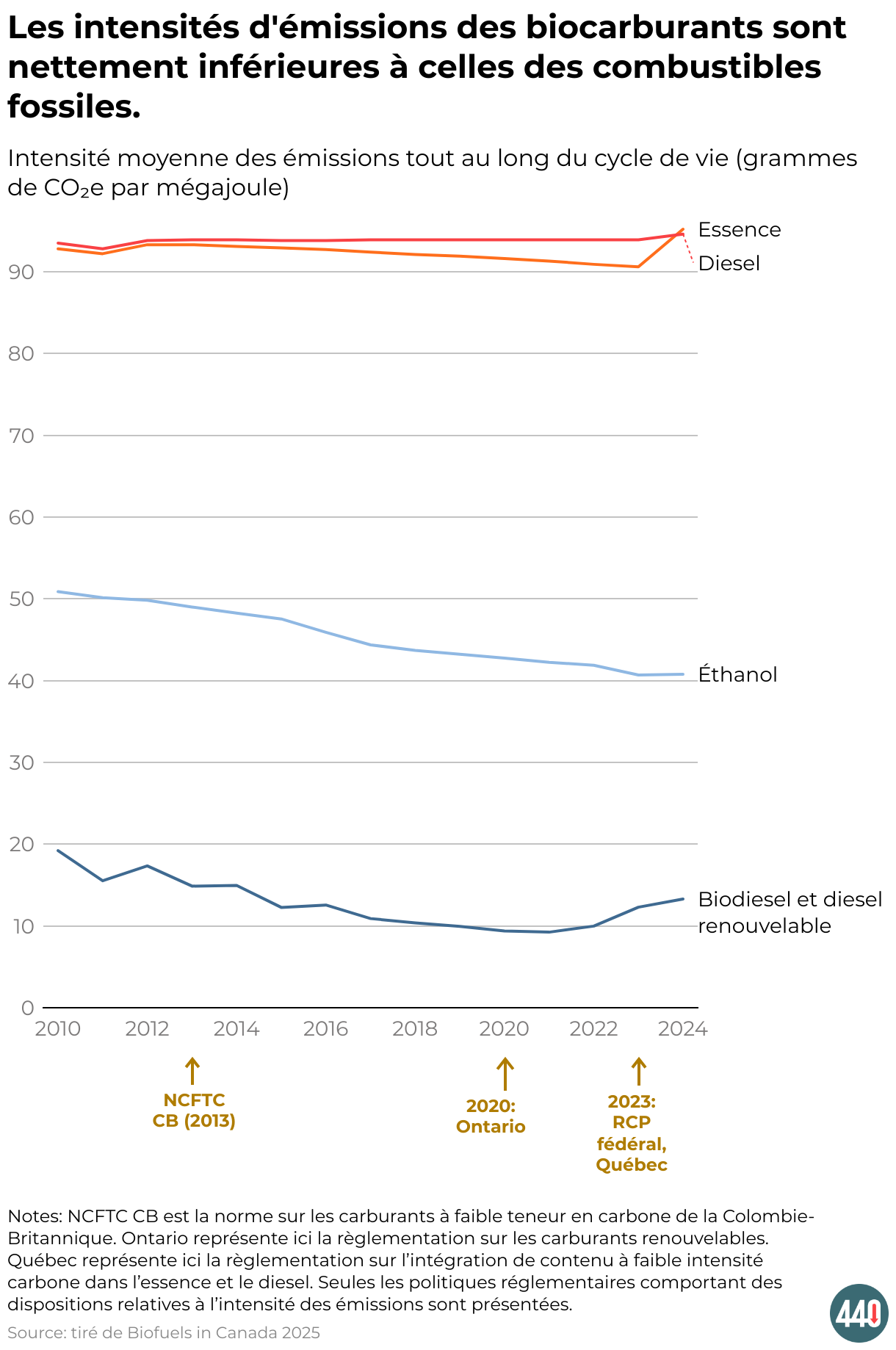 Graphique montrant la moyenne des émissions de cycle de vie de 2010 à 2024. Les moyennes pour l’essence et le diesel sont à peu près constantes et bien plus élevées que celle de l’éthanol, qui affiche une diminution soutenue et est à son tour plus élevée que la moyenne du biodiesel et du diesel renouvelable. Le graphique montre aussi les liens approximatifs entre les émissions de cycle de vie et l’entrée en vigueur d’importantes politiques fédérales et provinciales.
