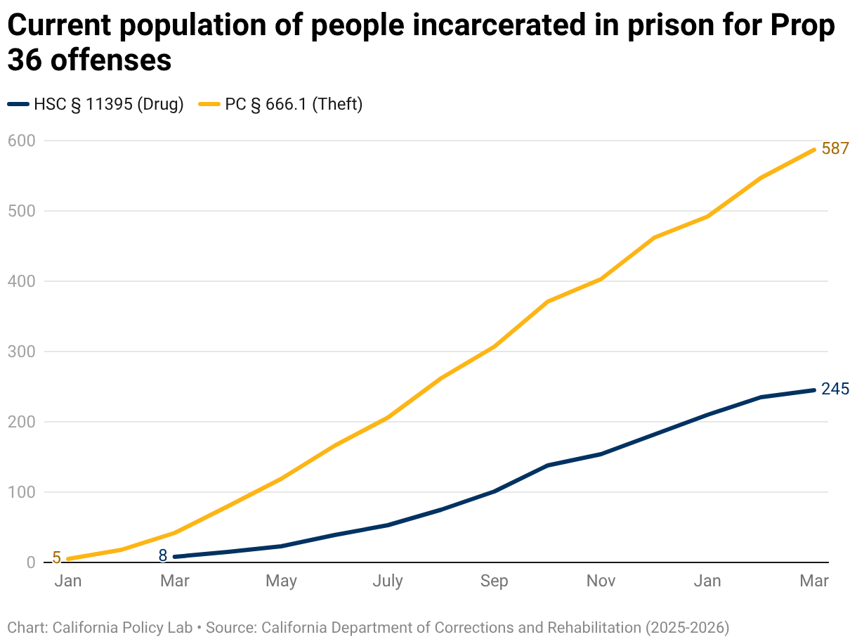 A line graph of the current population of people incarcerated in prison for Prop 36 offenses in California, where the population has steadily increased under both offenses. Under the Treatment-Mandated Drug-Possession Felony offense, 8 people were in custody as of March 2025, growing to 245 people by the end of March 2026. Under the Petty Theft with Prior Offense, 5 people were in custody as of January 2025, growing to 587 people by the end of March 2026.