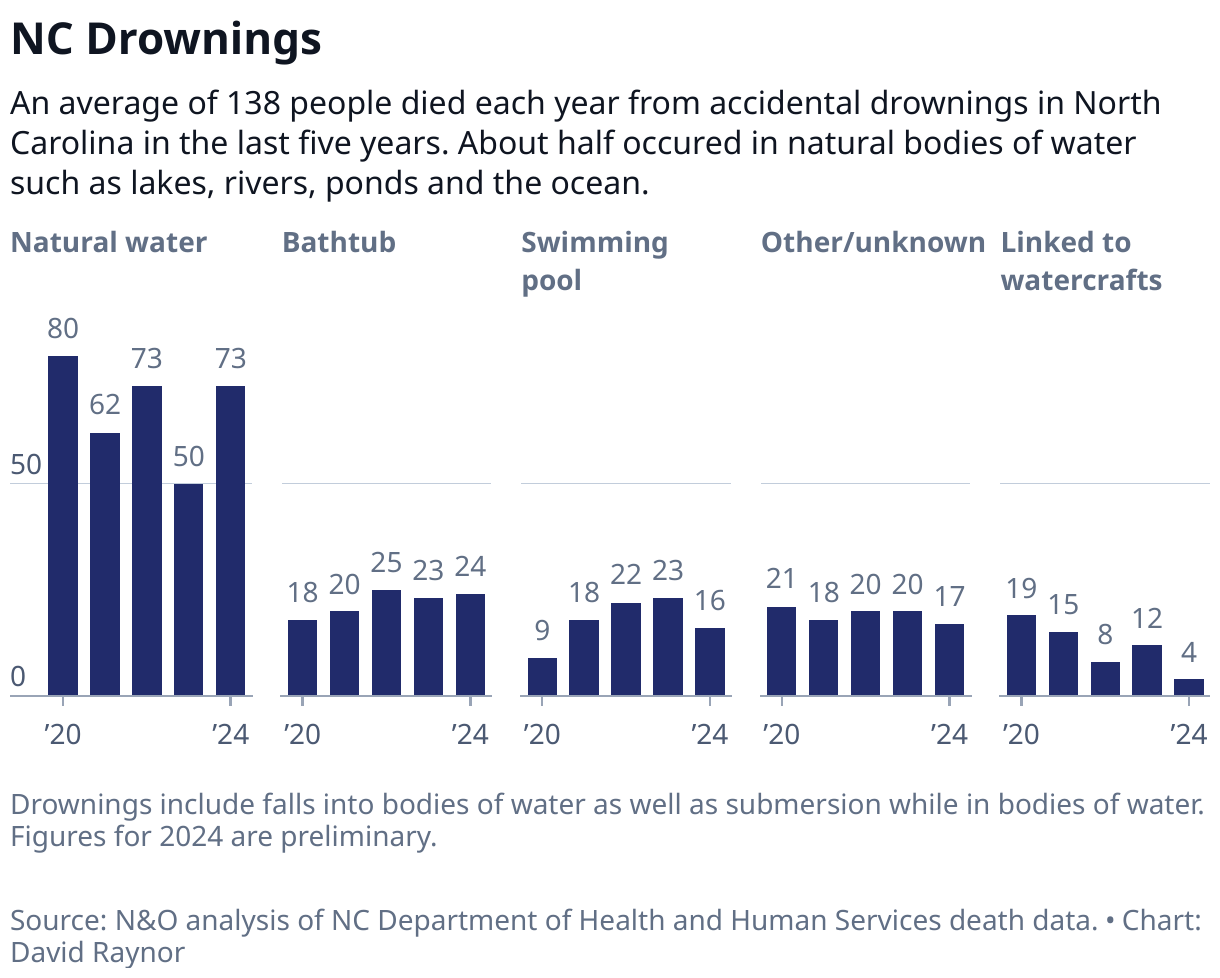 An average of 138 people died each year from accidental drownings in North Carolina in the last five years. About half occured in natural bodies of water such as lakes, rivers, ponds and the ocean.