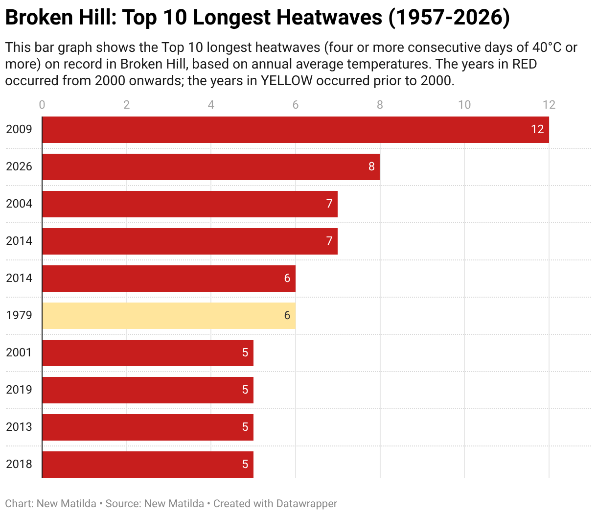 This horizontal bar chart shows the ten longest heatwaves recorded in Broken Hill, a remote outback mining town in far-western New South Wales, Australia, between 1957 and 2026. A heatwave is defined here as four or more consecutive days with maximum temperatures of 40 °C or higher. The bars are ranked by length, with longer bars indicating longer heatwaves. Years from 2000 onwards are coloured red, while years prior to 2000 are shown in yellow. The longest heatwave occurred in 2009, lasting 12 consecutive days. Most of the longest heatwaves have occurred since 2000, indicating that prolonged extreme heat events in Broken Hill have become more common in recent decades.