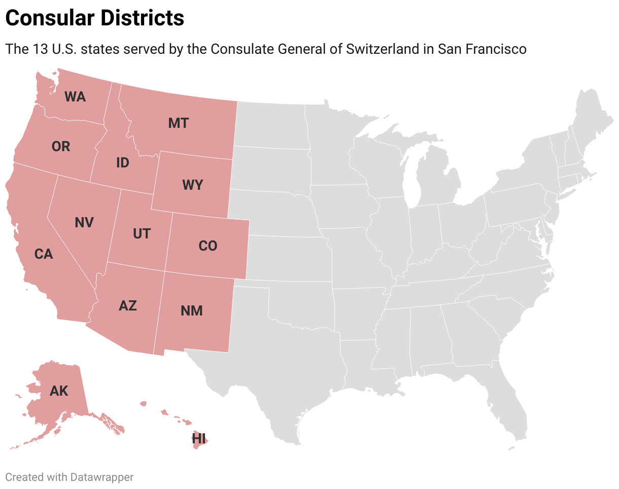 The 13 U.S. states served by the Consulate General of Switzerland in San Francisco