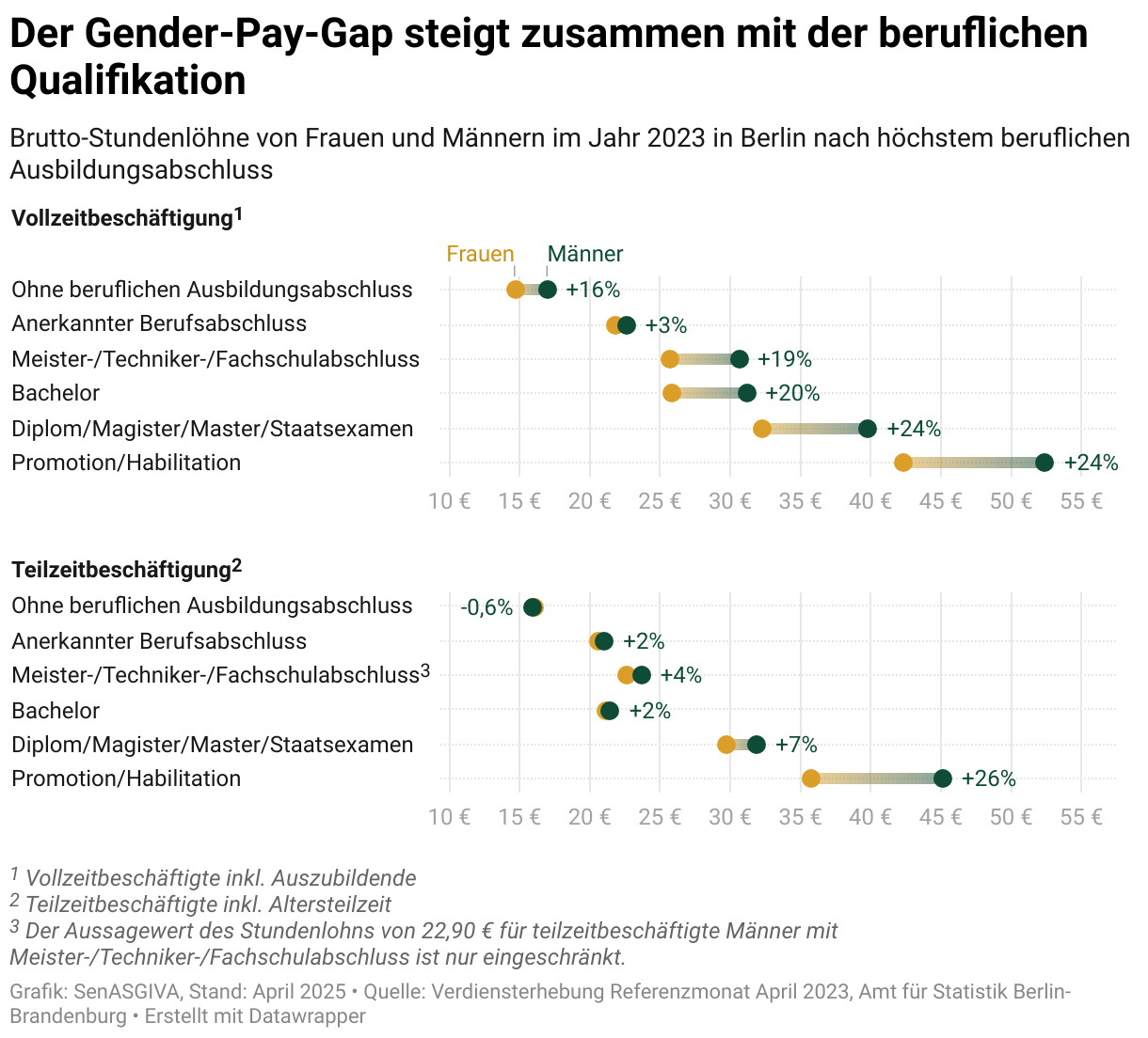 Bei Vollzeitbeschäftigten liegt die Spanne zwischen 3,4 Prozent und 23,3 Prozent, die Männer brutto mehr verdienen als Frauen. In Teilzeit verdienen die Berliner Männer teilweise weniger als die Frauen, bei den höheren akademischen Abschlüssen jedoch mehr. Die insgesamt größte Lücke klafft bei Teilzeitbeschäftigten mit Promotion oder Habilitation: hier gehen die Männer im Schnitt mit 26,2 Prozent mehr nach Hause.