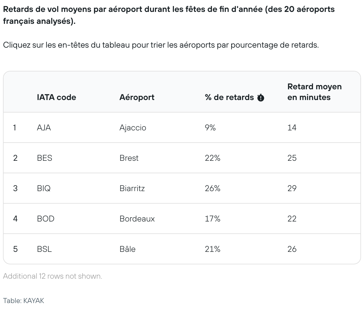 Retards de vol moyens par aéroport durant les fêtes de fin d'année (des 20 aéroports français analysés). Cliquez sur les en-têtes du tableau pour trier les aéroports par pourcentage de retards.