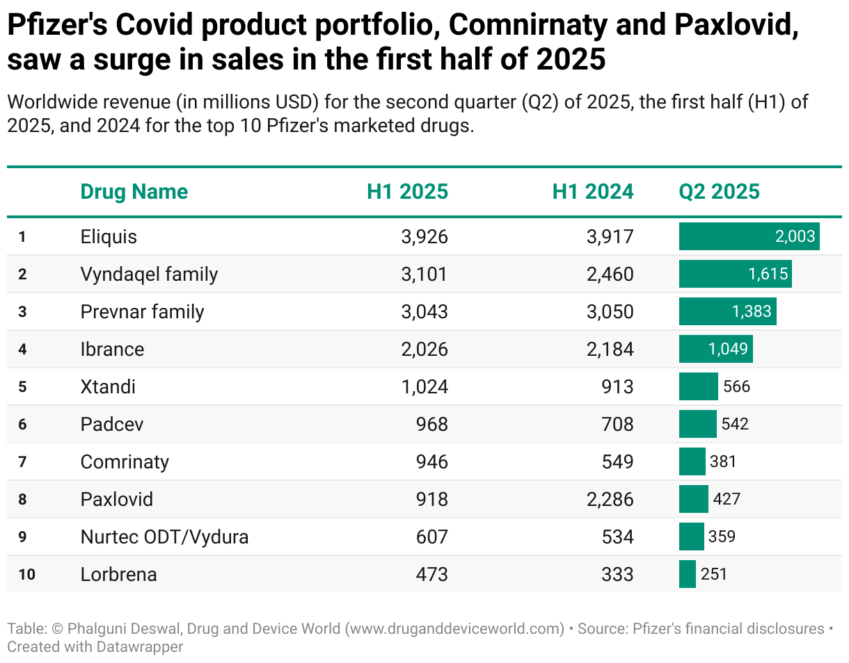 Worldwide revenue (in millions USD) for the second quarter (Q2) of 2025, the first half (H1) of 2025, and 2024 for the top 10 Pfizer's marketed drugs.