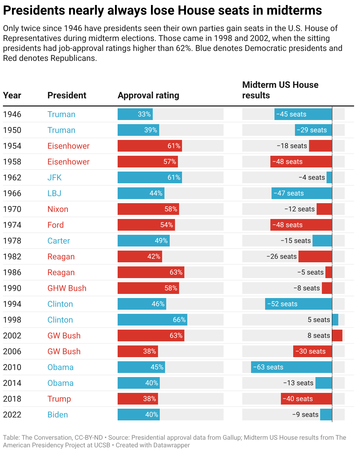 Only twice since 1946 have presidents seen their own parties gain seats in the U.S. House of Representatives during midterm elections. Those came in 1998 and 2002, when the sitting presidents had job-approval ratings higher than 62%. Blue denotes Democratic presidents and Red denotes Republicans.