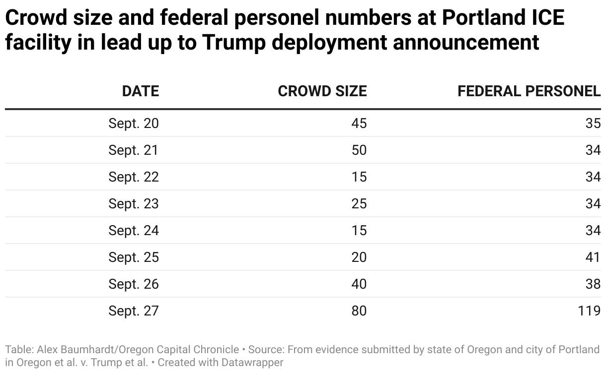 Crowd size and federal personel numbers at Portland ICE facility in lead up to Trump deployment announcement
