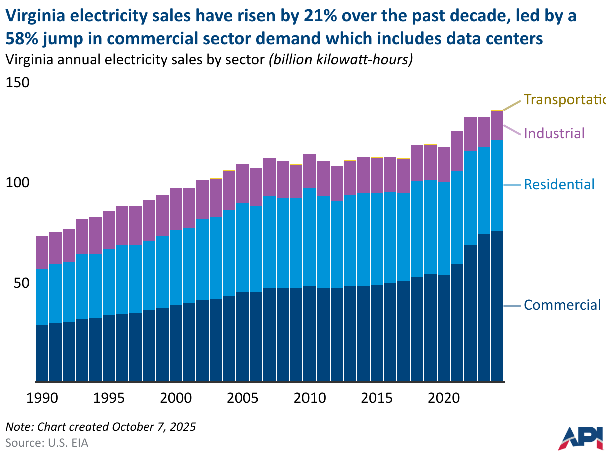Virginia annual electricity sales by sector (billion kilowatt-hours)
