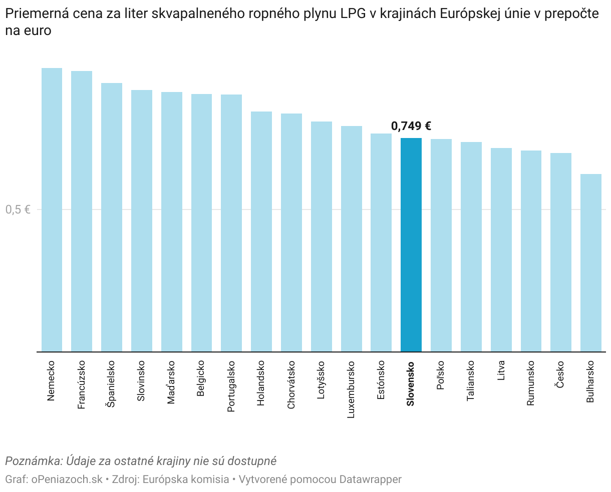 Priemerná cena za liter skvapalneného ropného plynu LPG v krajinách Európskej únie v prepočte na euro