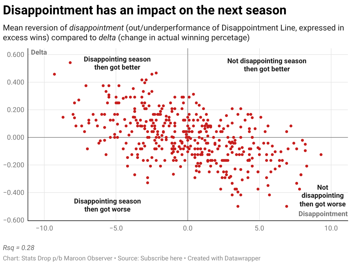 Mean reversion of disappointment (out/underperformance of Disappointment Line, expressed in excess wins) compared to delta (change in actual winning percetage)