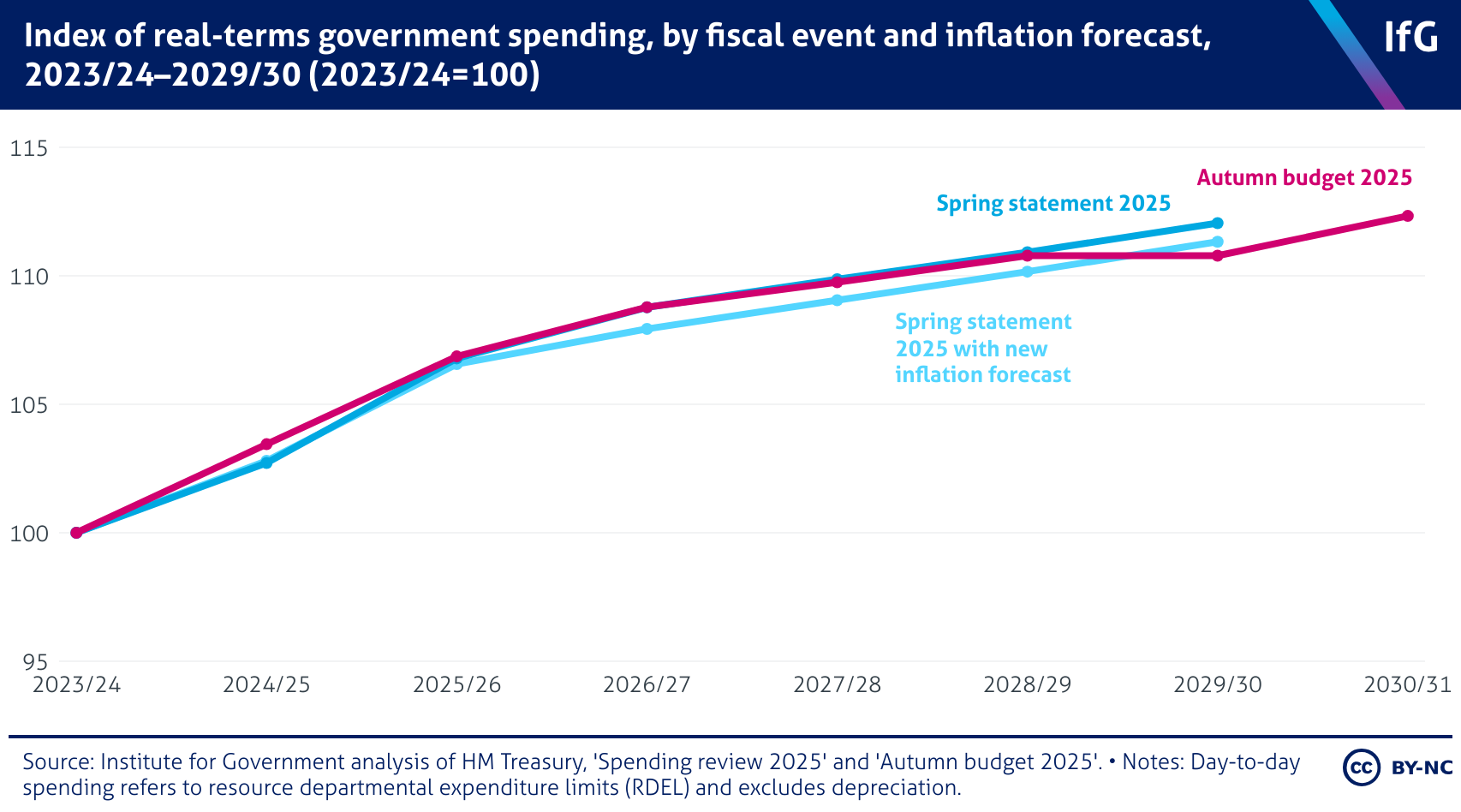 Index of real-terms government spending, by fiscal event and inflation forecast, 2023/24–2029/30 (2023/24=100)