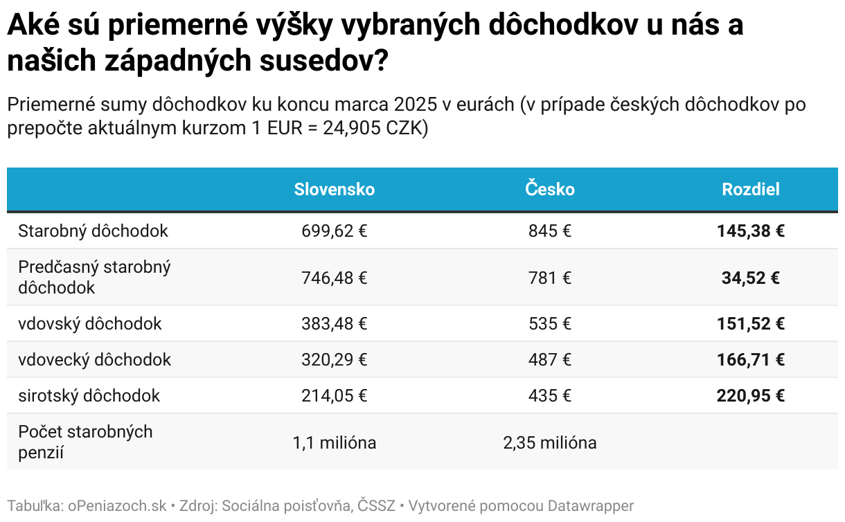 Priemerné sumy dôchodkov ku koncu marca 2025 v eurách (v prípade českých dôchodkov po prepočte aktuálnym kurzom 1 EUR = 24,905 CZK)