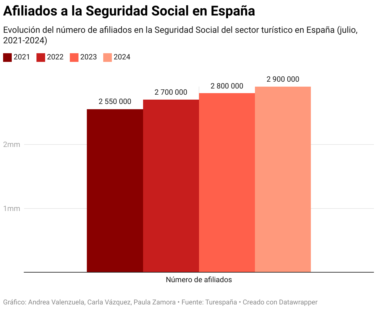 Evolución del número de afiliados en la Seguridad Social del sector turístico en España (julio, 2021-2024)