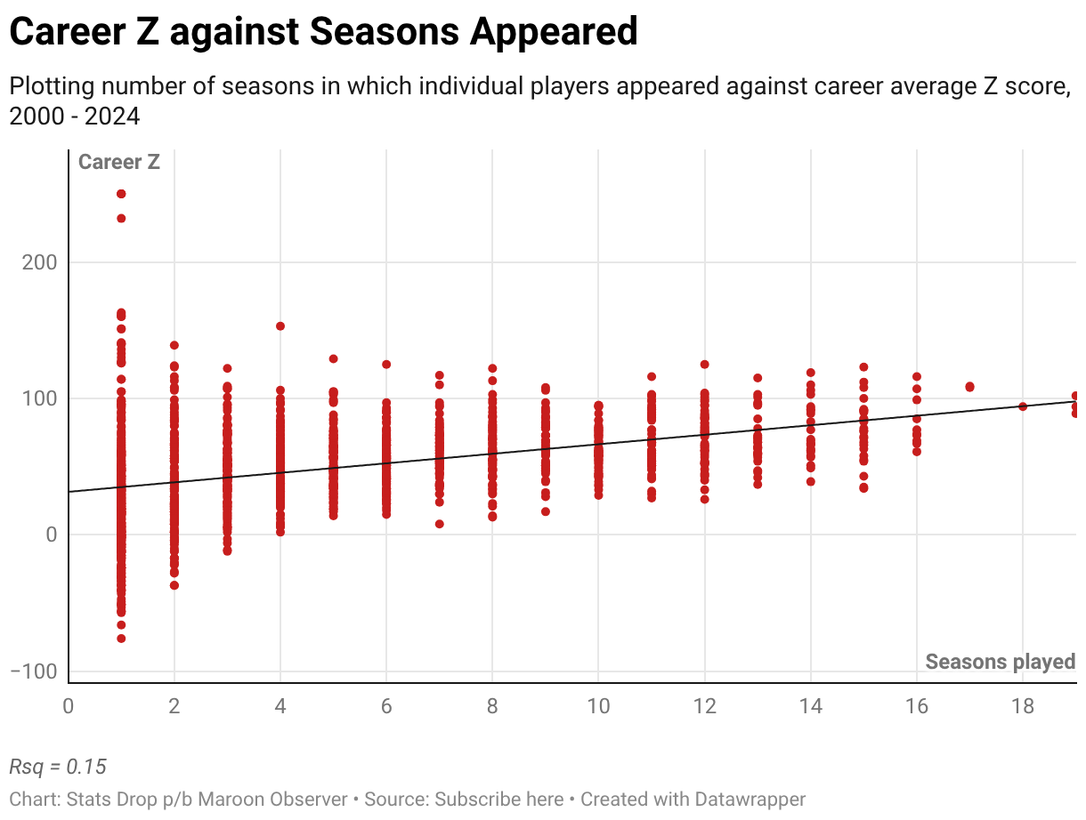 Plotting number of seasons in which individual players appeared against career average Z score, 2000 - 2024