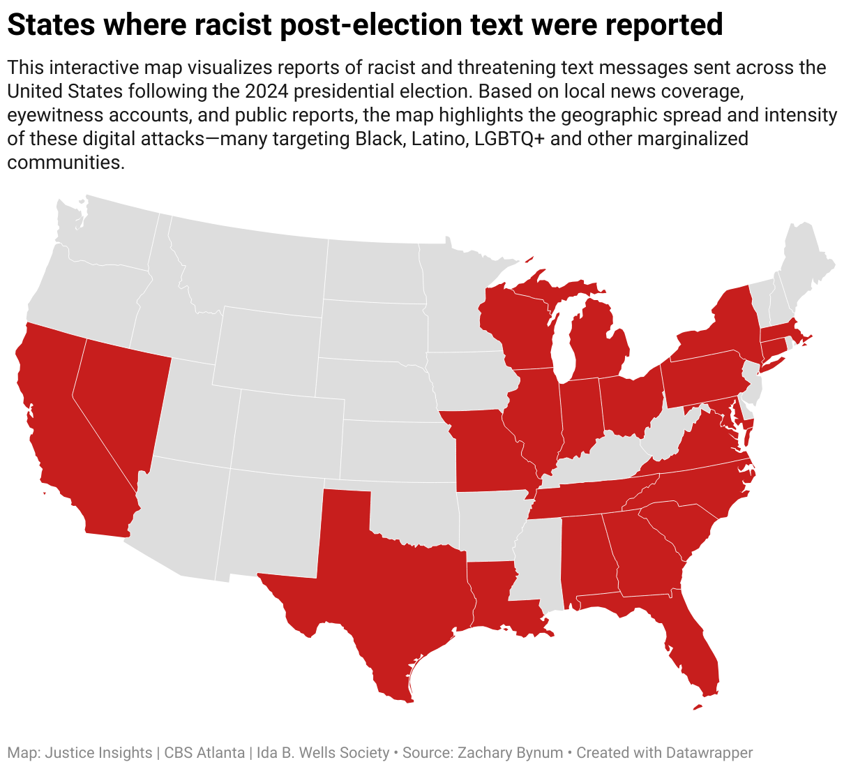 This interactive map visualizes reports of racist and threatening text messages sent across the United States following the 2024 presidential election. Based on local news coverage, eyewitness accounts, and public reports, the map highlights the geographic spread and intensity of these digital attacks—many targeting Black, Latino, LGBTQ+ and other marginalized communities.