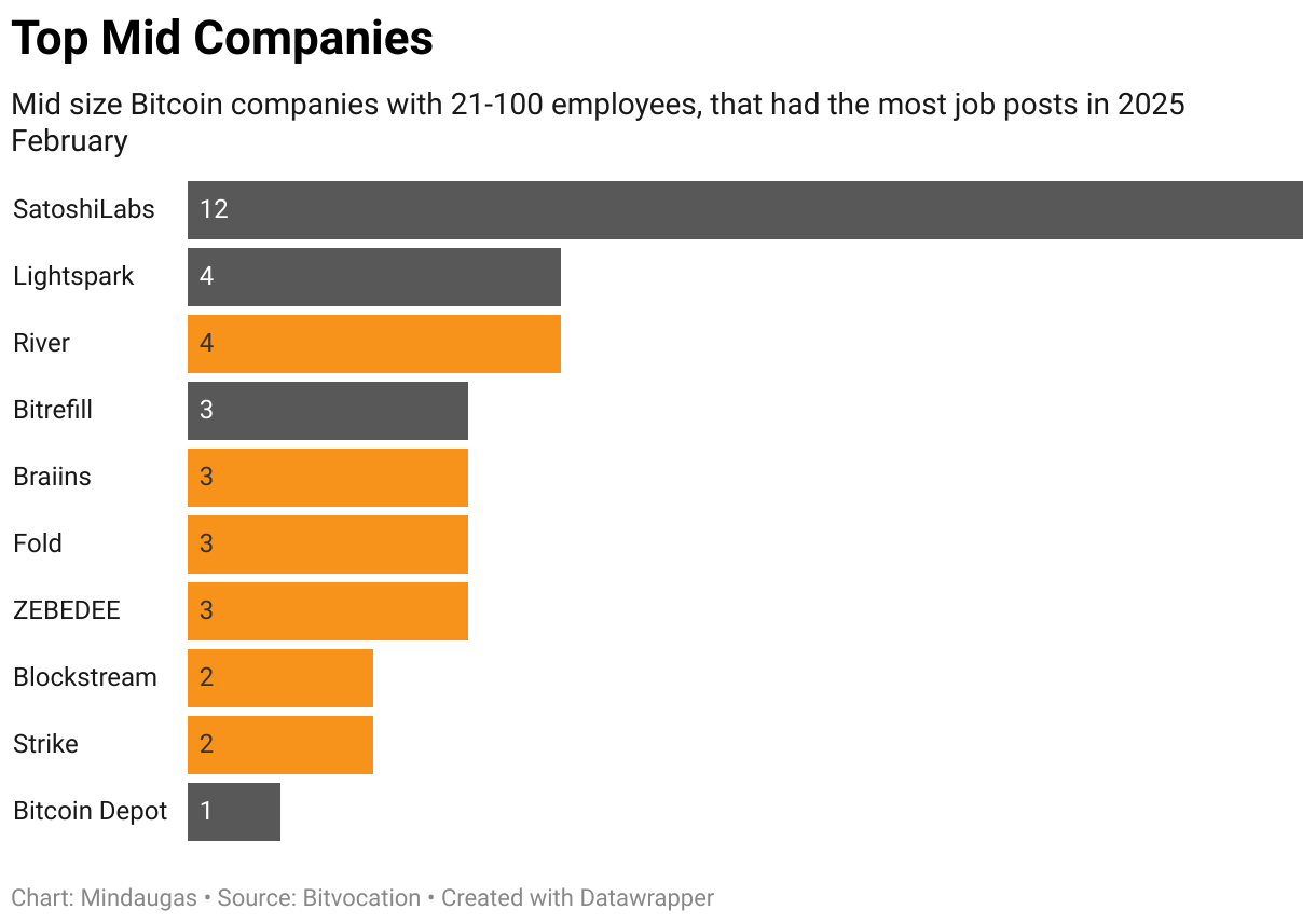 Mid size Bitcoin companies with 21-100 employees, that had the most job posts in 2025 February