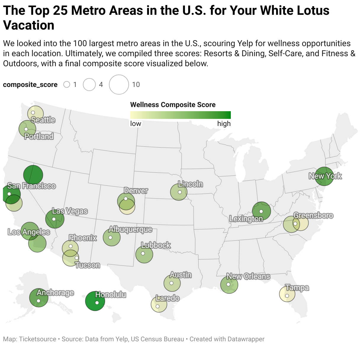 We looked into the 100 largest metro areas in the U.S., scouring Yelp for wellness opportunities in each location. Ultimately, we compiled three scores: Resorts & Dining, Self-Care, and Fitness & Outdoors, with a final composite score visualized below.